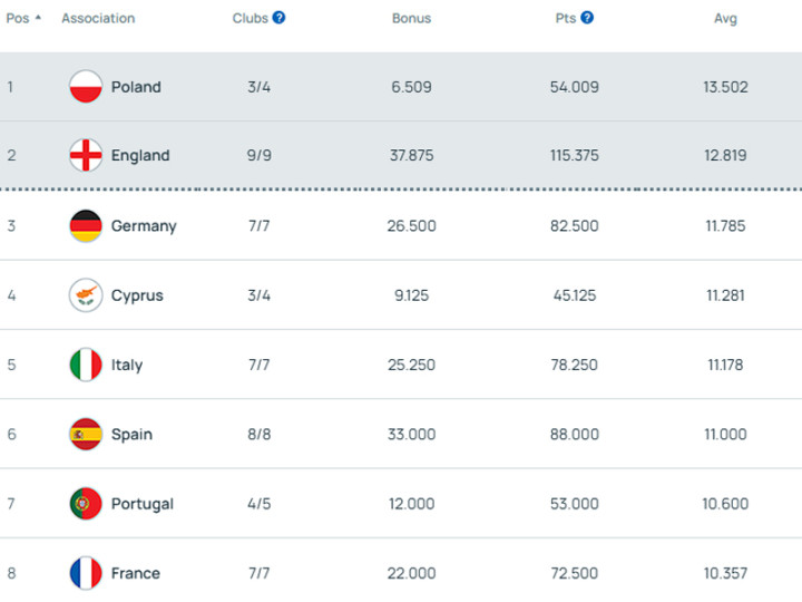 根据欧足联最新的积分,波兰联赛和英超暂时排在前两名,德甲、意甲、西甲和法甲纷纷进入前八。波兰剩下参赛的三支球队全部都在欧协联,一队直通16强,两队需要参加附加赛,相信随着赛事的深入,加上欧冠权重较大,波兰的排名很快会下降。