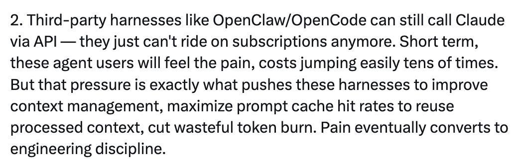 AI工作坊组织者@newlinedotco评论称:订阅的“all you can eat”套餐从一开始就是定时炸弹——第三方harness(如OpenClaw)24/7循环调用,API成本可能高达5000美元,而订阅仅200美元。官方工具(如Claude Code)因优化prompt cache才可持续。