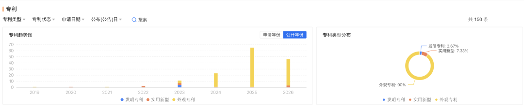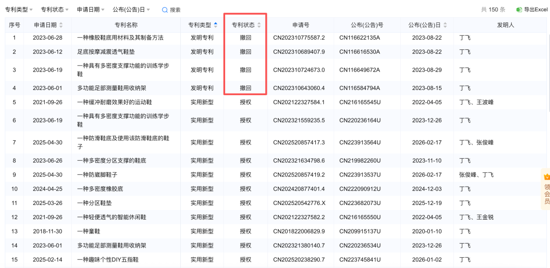 据企业预警通数据,泰兰尼斯母公司杭州泰潼商贸有限公司共拥有150项有效专利,其中约90%为外观设计专利,涉及鞋底科技、足部支撑等核心功能的发明专利数量极少,且部分发明专利已处于“撤回”状态。