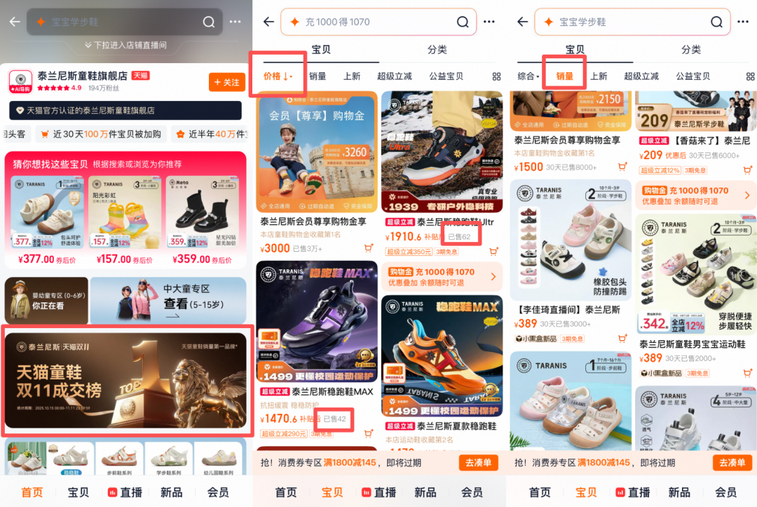 据报道,2024年全年,泰兰尼斯共售出600万双童鞋,营收突破30亿元,同比增长约50%,并在2025年双十一期间同时登顶天猫、京东童鞋销量榜单,超越耐克儿童、安踏儿童、FILA KIDS等知名品牌。