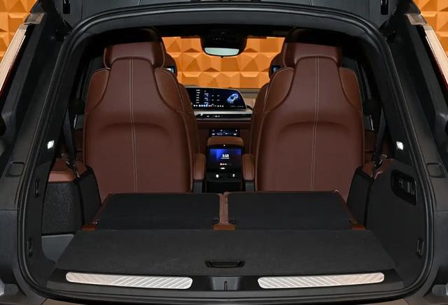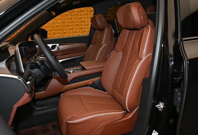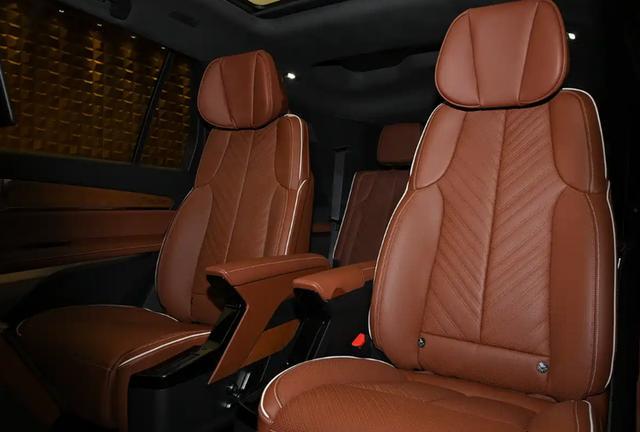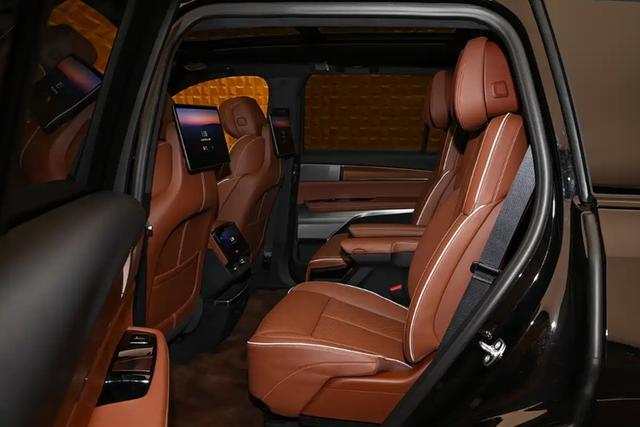 二排中央通道区域设有8英寸功能控制屏,座椅后方也提供独立娱乐屏,支持爱奇艺、QQ音乐等丰富应用生态。座椅延续了美式“大沙发”的宽大舒适风格,皮质纹理缝线与宽大的肩部、腰部支撑相结合,贯穿座椅的白色缝线进一步诠释了美式豪华质感。空间布局上,新车采用2+2+2六座形式,前排座椅标配加热、通风及按摩功能,配备五区空调控制系统。后备厢常规容积为430升,最大可扩展至2271升。